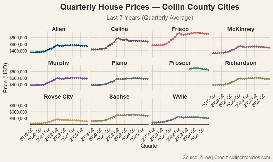 Housing prices across major cities in Collin County surged dramatically in the years following the COVID-19 pandemic, according to quarterly housing data from Zillow covering the last seven years. Cities such as Frisco, McKinney, Allen, Plano, and Murphy experienced particularly sharp increases between 2020 and 2023, reflecting one of the fastest housing market expansions in North Texas. However, recent quarters show signs that the market is stabilizing—and in some areas, beginning to cool.