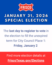 Frisco residents are gearing up to cast their votes in a special election that will determine who fills the vacant Place 1 seat on the city council. The election, scheduled for Saturday, January 31, 2026, will decide who represents the city at large for the remainder of the current term, which runs through May 2027.